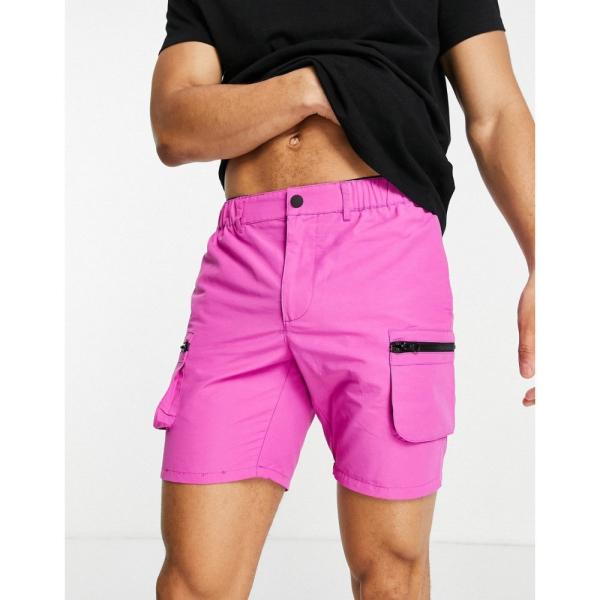 エイソス ASOS DESIGN メンズ ショートパンツ スキニー・スリム カーゴ ボトムス・パンツ slim nylon shorts with cargo pockets in hot pink ピンク即日発送